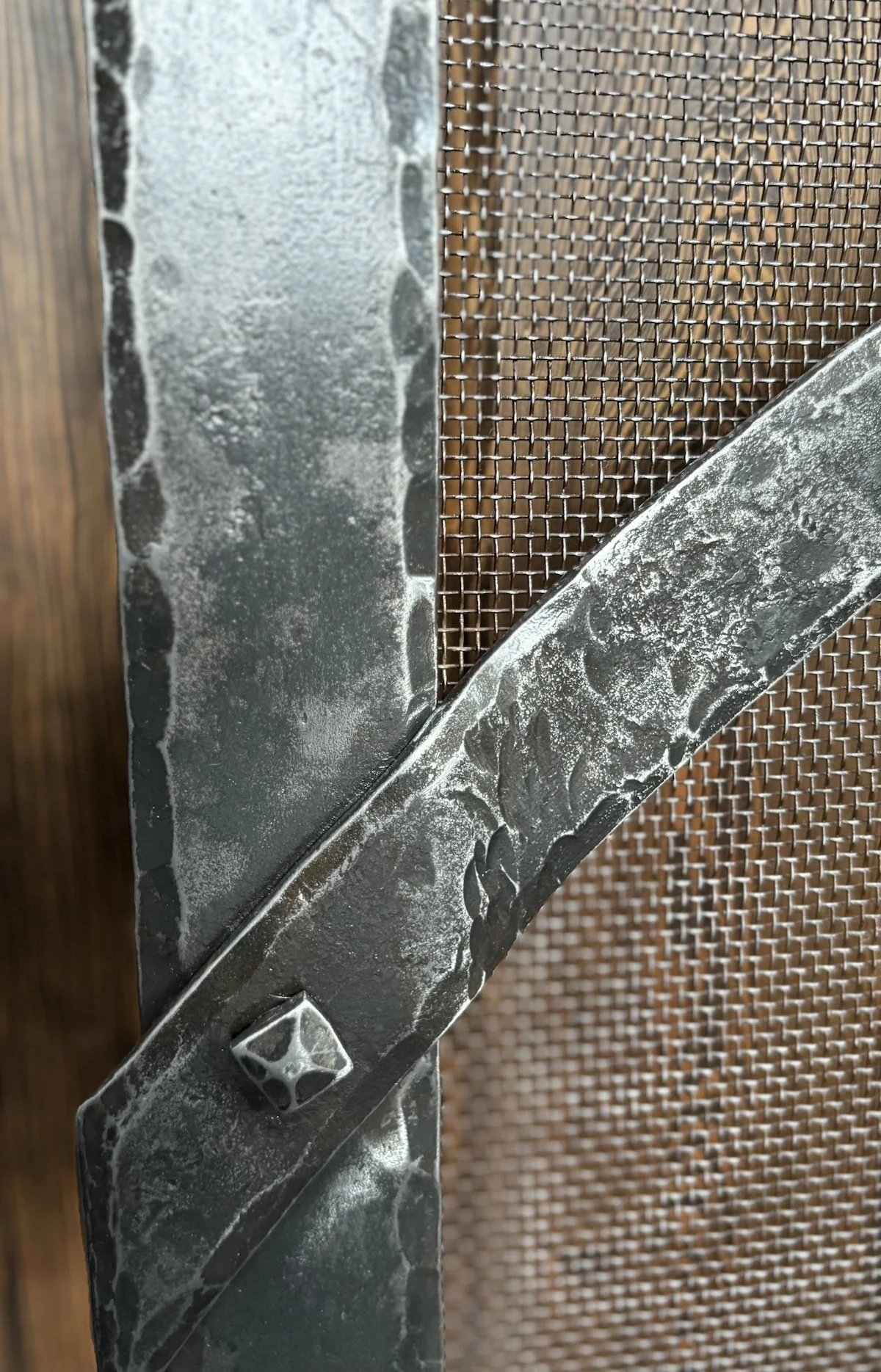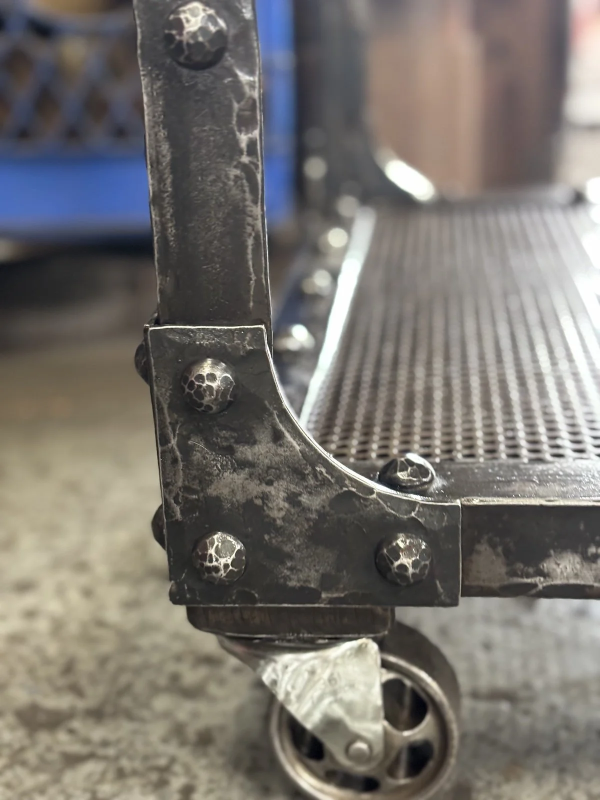 Hammered copper top, textured angle iron frame, perforated steel shelf & hand forged rivets, vintage casters... oil & wax.