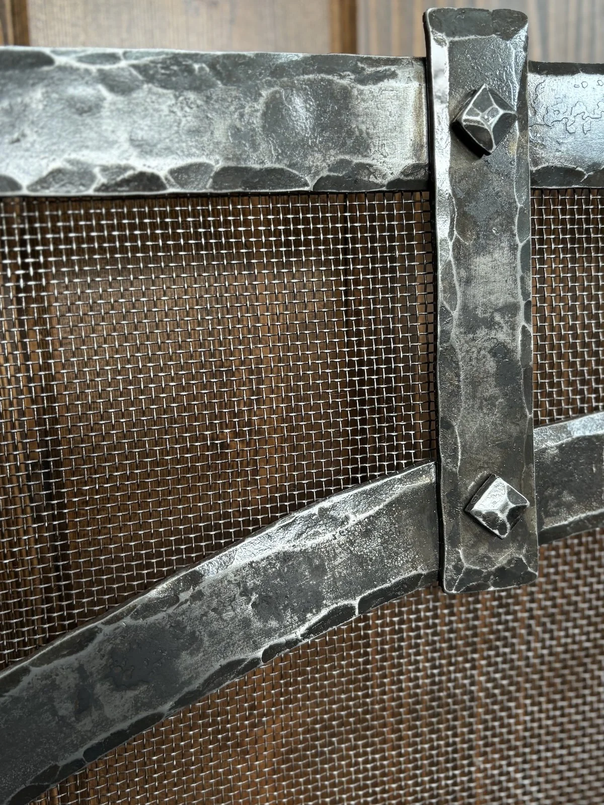 Hand forged fireplace tool set with pokers, shovel & broom.
